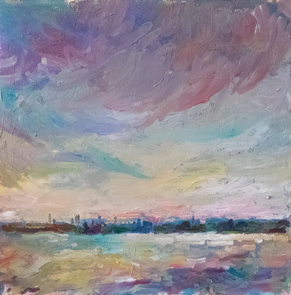 There was quite a strong wind blowing when I did this painting and there was intermittent rain; the sky took on some really interesting colour and there was much varying colour in the river also. Painting with a strong metal easel, it was sometimes lifted by the strong wind which had presented quite a challenge.