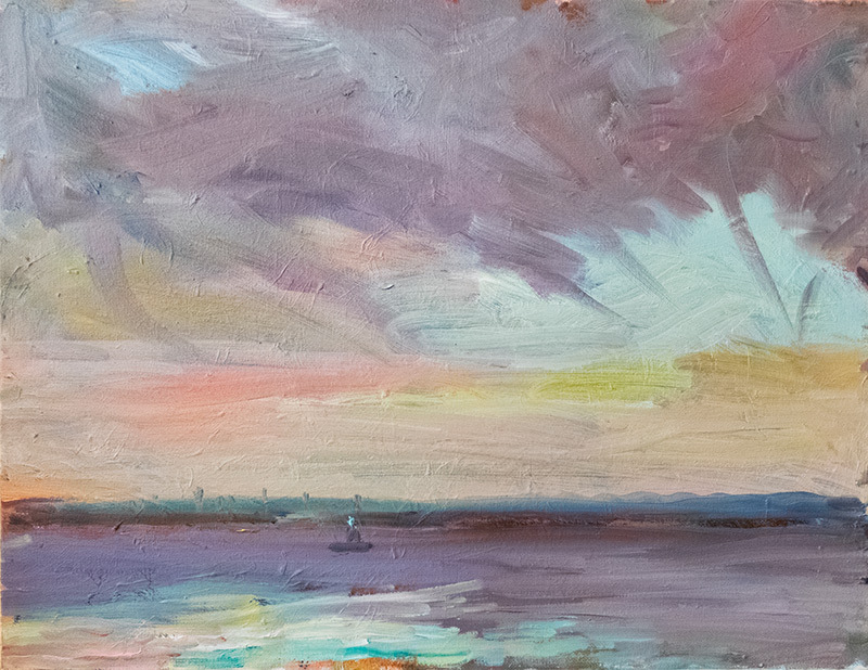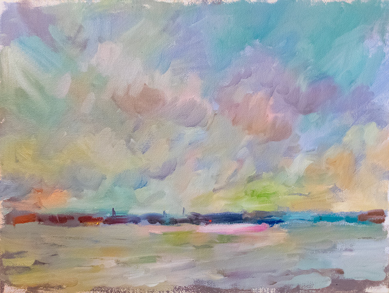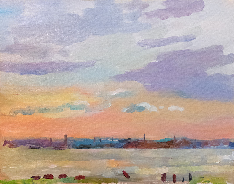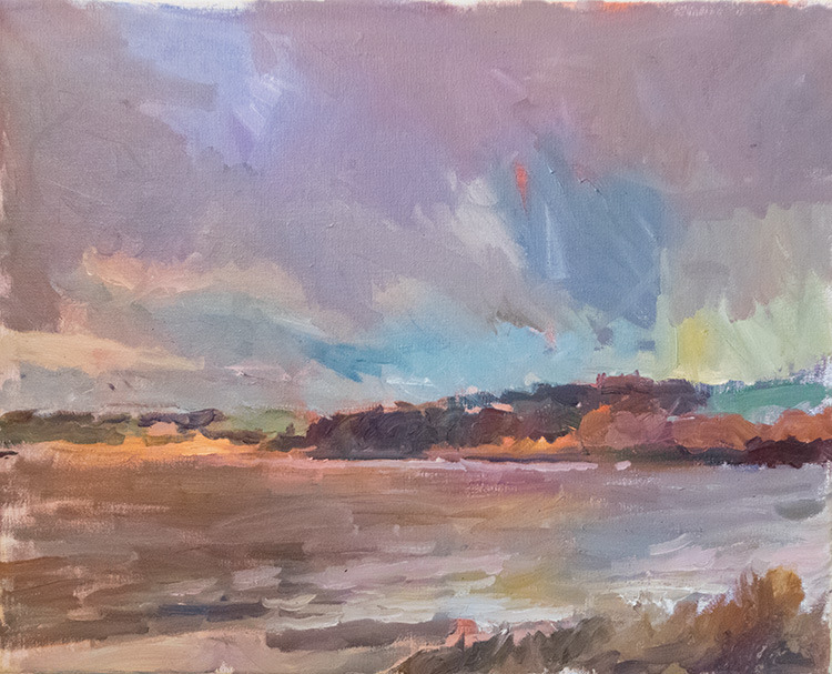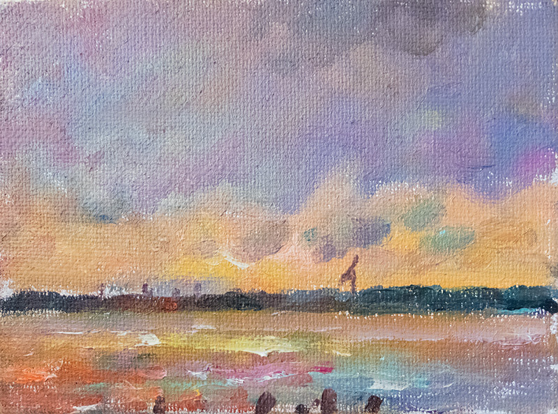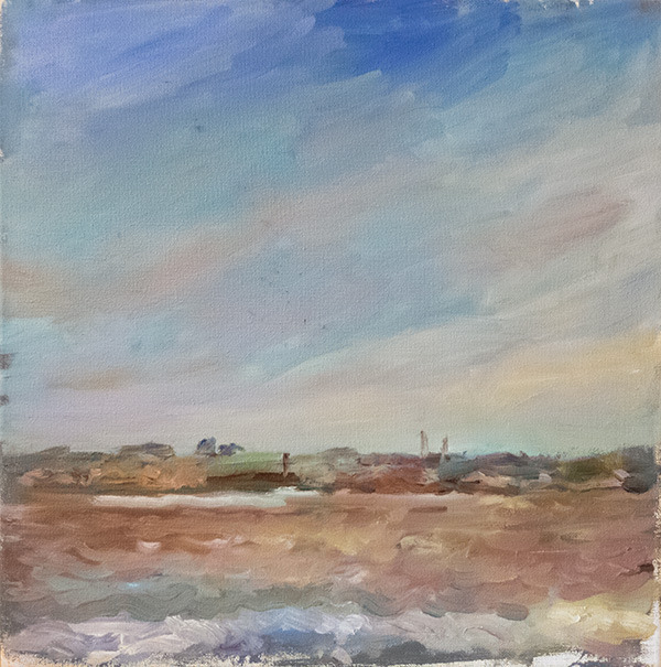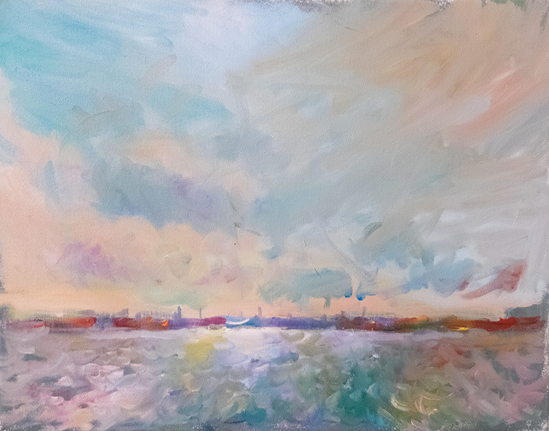 “I’ve been exploring painting on the Humber recently at the moment just generally Humber and sky. I have been attempting different approaches as to the painting of this what I think can be a difficult subject often; generally have been trying to convey the subject in an impressionistic manner. Most of the paintings have been done on site to try to capture the ever changing light.”